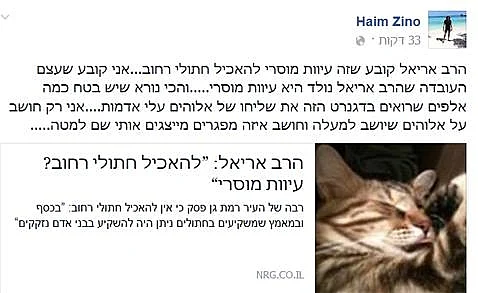 חיים צינוביץ' החליט שהוא לא עובר על המקרה לסדר היום, ובפייסבוק שלו הוא פרסם הודעה בגנות הרב, שם הוא כתב: "הרב אריאל קובע שזה עיוות מוסרי להאכיל חתולי רחוב...אני קובע שעצם העובדה שהרב אריאל נולד היא עיוות מוסרי.....והכי נורא שיש בטח כמה אלפים שרואים בדגנרט הזה את שליחו של אלוהים עלי אדמות....אני רק חושב על אלוהים שיושב למעלה וחושב איזה מפגרים מייצגים אותי שם למטה....."