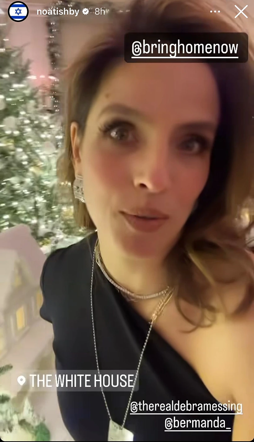 אז נכון היא לא שגרירה באופן רשמי, נראה שגם בבית הלבן מחזיקים מתשבי והיא הוזמנה אמש לבית הלבן למסיבת חנוכה בנוכחות נשיא ארצות הברית ג'ו ביידן. הדוגמנית היפה, שהגיעה למקום מאובזרת בתכשיטים שלא מותירים מי היא ומאין הגיעה, כשענדה את שרשרת דיסקית החטופים, טבעות ושרשראות עם מגן דוד, החליטה להשאיר מזכרת חשובה על אחד מעצי האשוח המפוזרים בבית. נועה, תלתה את שרשרת דיסקית החטופים הרשמית עם הכיתוב בעברית "הלב שלנו שבוי בעזה".