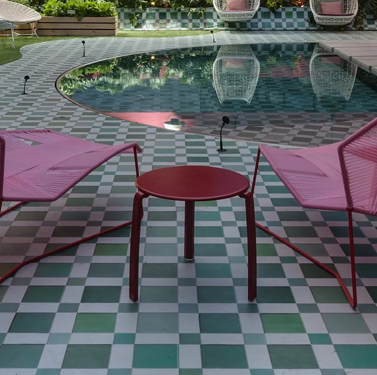 שולחן המתכת הנמוך של המותג הצרפתי היצירתי לריהוט חוץ FERMOB נועד להיות מונח לצד הכסא, הערסל, כסא הנוח ולשמש כמקום האידיאלי למשקפי השמש, לספר או לכוס המשקה.