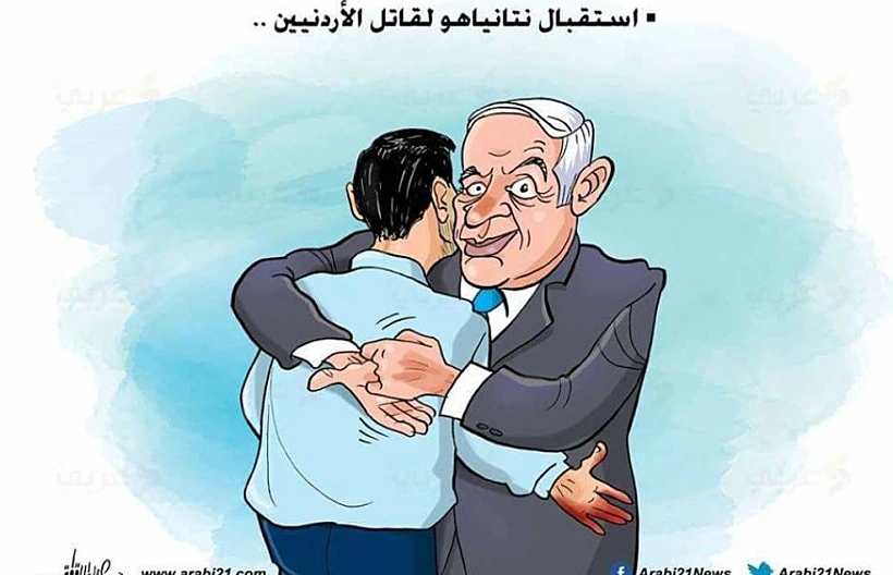 במקביל, קריקטורה שמתפרסמת באתר "ערבי 21" מאויר המאבטח מחובק עם ראש הממשלה בנימין נתניהו והכיתוב שמופיע הוא: "קבלת הפנים של נתניהו לרוצח הירדנים".