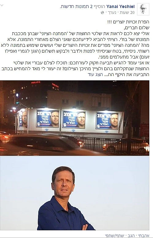 שבוע לפני הבחירות ושערורייה חדשה מעיבה על קמפיין הבחירות של המחנה הציוני. בפוסט שעלה אמש(ב) לפייסבוק טוען הצלם ינאי יחיאל כי זכויות היוצרים על דיוקנו של יצחק הרצוג המלווה את הקמפיין שייכות למעשה לו. עוד הוא טוען, כי השימוש נעשה ללא רשותו. האם המחנה ציוני אכן הפר את זכויות היוצרים של הצלם?