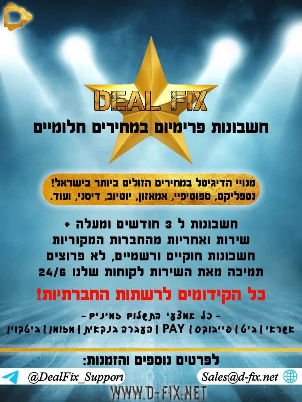תכירו את חברת Deal Fix - חברה מצליחה שהוקמה לפני מספר שנים, ושמביאה לכם חשבונות פרימיום כדוגמת מנוי בנטפליקס, ספוטיפיי, ועוד במחירים מוזלים ואטרקטיביים במיוחד ועם אפשרויות תשלום נוחות יותר.