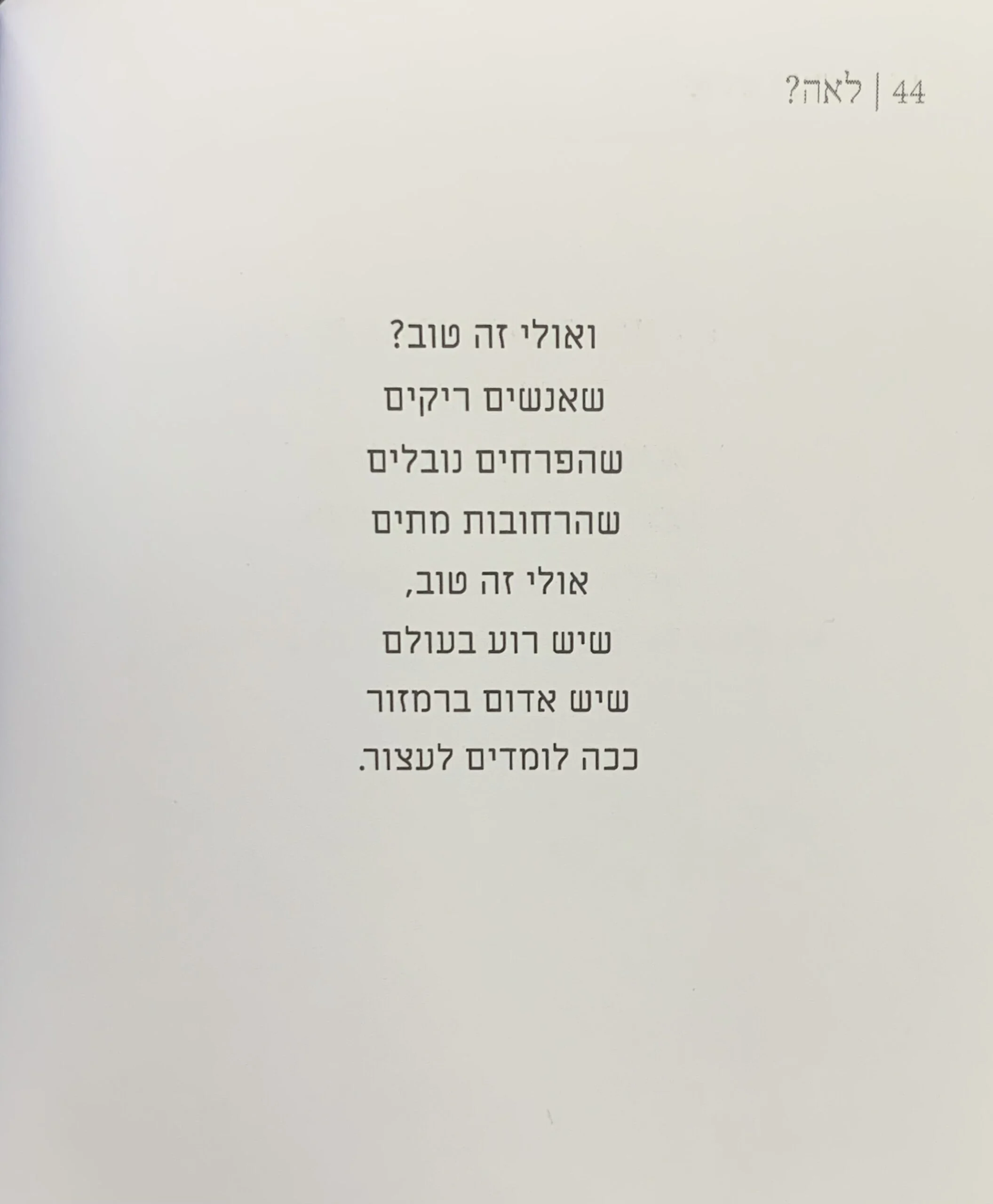 ליאה: "קודם כל, מדובר בספר שירה. מרבית השירים בספר הם קצרים ומתומצתים מאוד, סגנון מאוד מודרני ושונה מהדרך בה מרביתנו אולי חושבים על שירה. אחת המטרות של הספר היא לקחת דברים יום-יומיים, ולהאיר אותם באור אחר, פחות שגרתי וצפוי, לגרום לאנשים להסתכל על הדברים אחרת. מעבר לכך, הספר משקף בעיני מעבר חד בין רגשות: אהבה, שמחה, יופי ועצב. בראות עיני, מטרת הספר היא לתאר בצורה אמיתית יותר את חוויות החיים. אני סבורה שמרגישים מנעד רחב של רגשות בעת הקריאה: שנאה, אהבה, אהבה לאנשים, לטבע, כעס ועוד. עם זאת, לאחר ששוחחתי עם אנשים שקראו את הספר, ראיתי שהרגשות שייחסתי לטקסטים מסוימים הם לא אותם רגשות שהתעוררו בקרב הקוראים. אני מאוד אוהבת לגלות שלכל קורא יש חוויה אינדיבידואלית משלו עם הקריאה בספר".