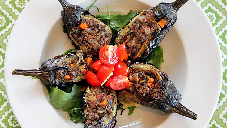 כשחשבתי על התרומה שלי לארוחת ראש השנה אצל המשפחה, החלטתי לנצל את החצילים הקטנים שמופיעים עכשיו בשווקים. הם כמעט נטולי גרעינים ודחוסים בטעם. בשולחן החג אצלנו הם בדרך כלל מככבים בגרסה המתוקה - אימי הופכת אותם לריבה משגעת, ואני החלטתי להפוך אותם למנת ממולאים.