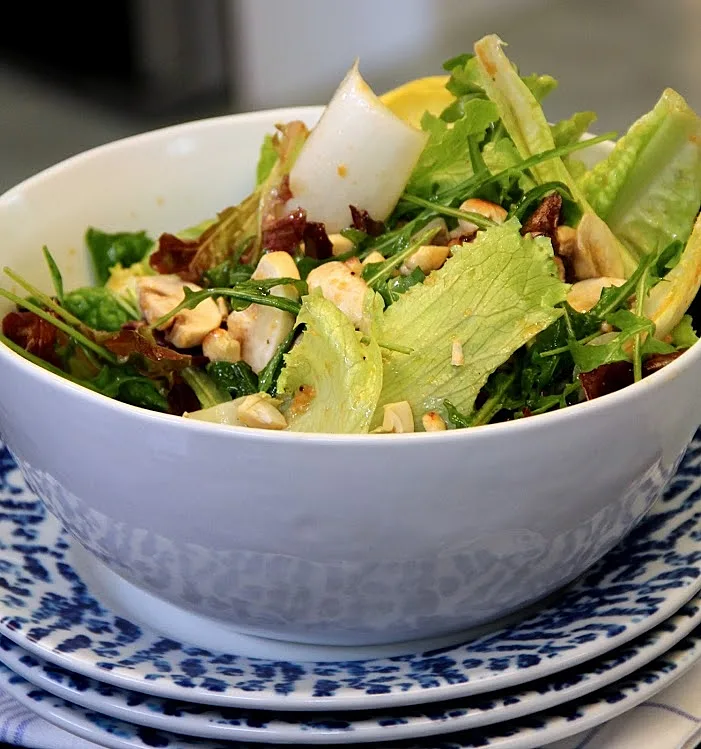 - יוצקים את הרוטב על הסלט, מערבבים ושופכים את הקשיו מלמעלה.