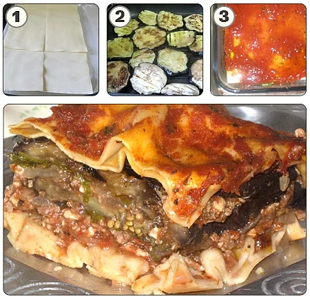 4. מניחים בתבנית 2 עלי לזניה, מעל מפזרים עד כיסוי את תערובת הבשר, מעל את יתרת הפטרוזיליה וכוסברה ומכסים בשכבת פרוסות חצילים וחוזר חלילה, כשבשכבה העליונה מסיימים בשכבת עלי לזניה.