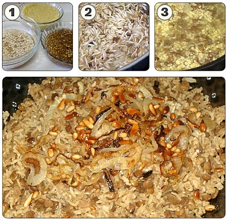 - בסיר אחר מטגנים את הבצל הקצוץ במעט שמן, מוסיפים את האורז/בורגול. מוסיפים תבלינים ואת העדשים.