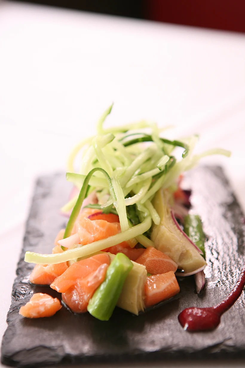 על הסלט אין צורך להכביר במילים - עלים ירוקים ברוטב ויניגרט מוצלח (למרות שהיה קצת יותר מדי ממנו), בליווי פרוסות באגט (עוד באגט) עם גבינת עיזים שהיו מוצלחות מאוד. מנת הסביצ'ה סלמון הייתה פשוטה וחביבה, התיבול - מיץ לימון, מלח גס ושמן זית - היה חמצמץ במידה ועדין מאוד.