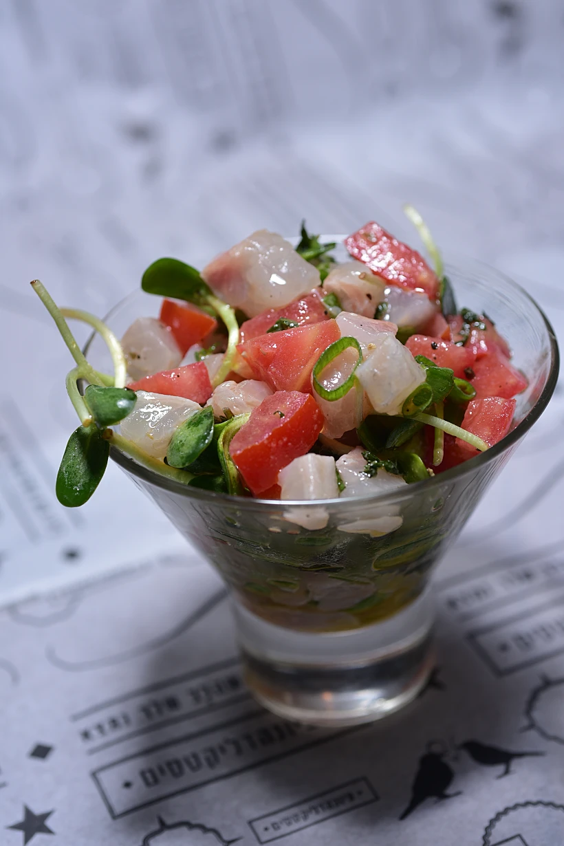 לפני שעברנו לעיקרית, המשכנו עם מנה של סביצ'ה, אשר באותו ערב הותקן מדג דניס. הסביצ'ה מוגש בכוס קוקטייל ובין השאר יחד עם עגבניות ונבטי חמניה. היחס בין הדג לשאר מרכיבי המנה הוא מהמרשימים שנתקלתי בהם לאחרונה. הדג היה טרי, וחובבי הטעם "הדגי" ייהנו מהמנה הזו מאוד, מאחר ויש לה טעמים מאוד מודגשים.